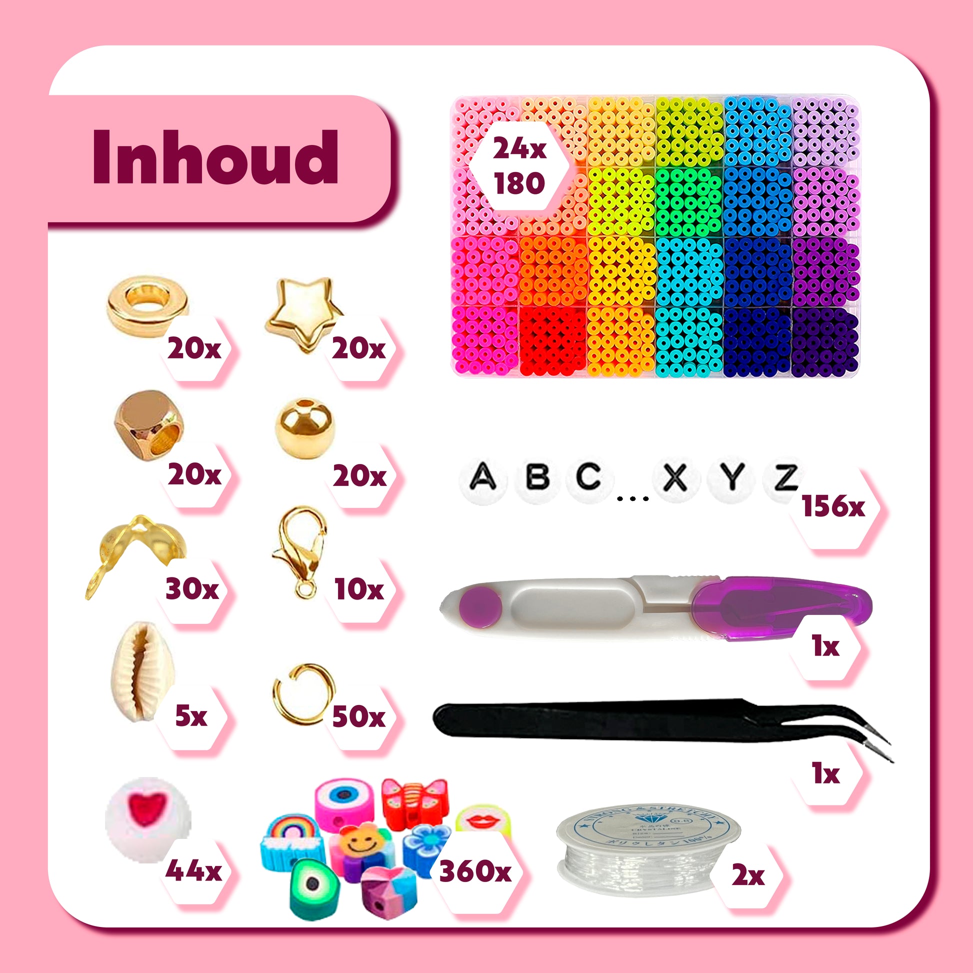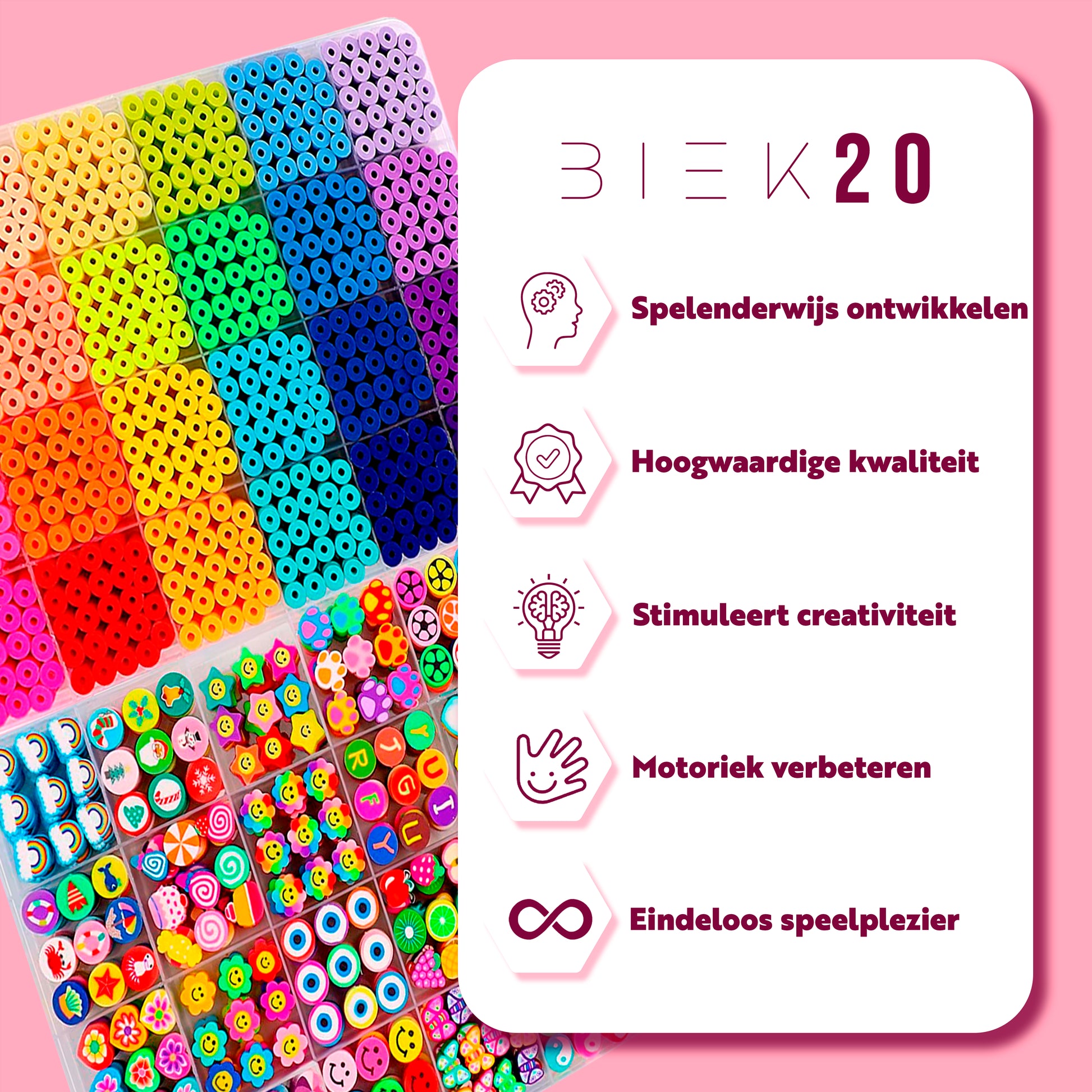 Als je graag creatief bezig bent en de mooiste sieraden wilt maken, kun je met deze kralenset van BIEK20 direct aan de slag. Door de royale keus in kleur en accessoires maakt ieder zijn eigen unieke sieraad, sleutelhanger of andere creatie. Voeg een persoonlijke touch toe met de letterkralen en laat de kleurrijke polymeer kralen je ontwerpen opvrolijken!